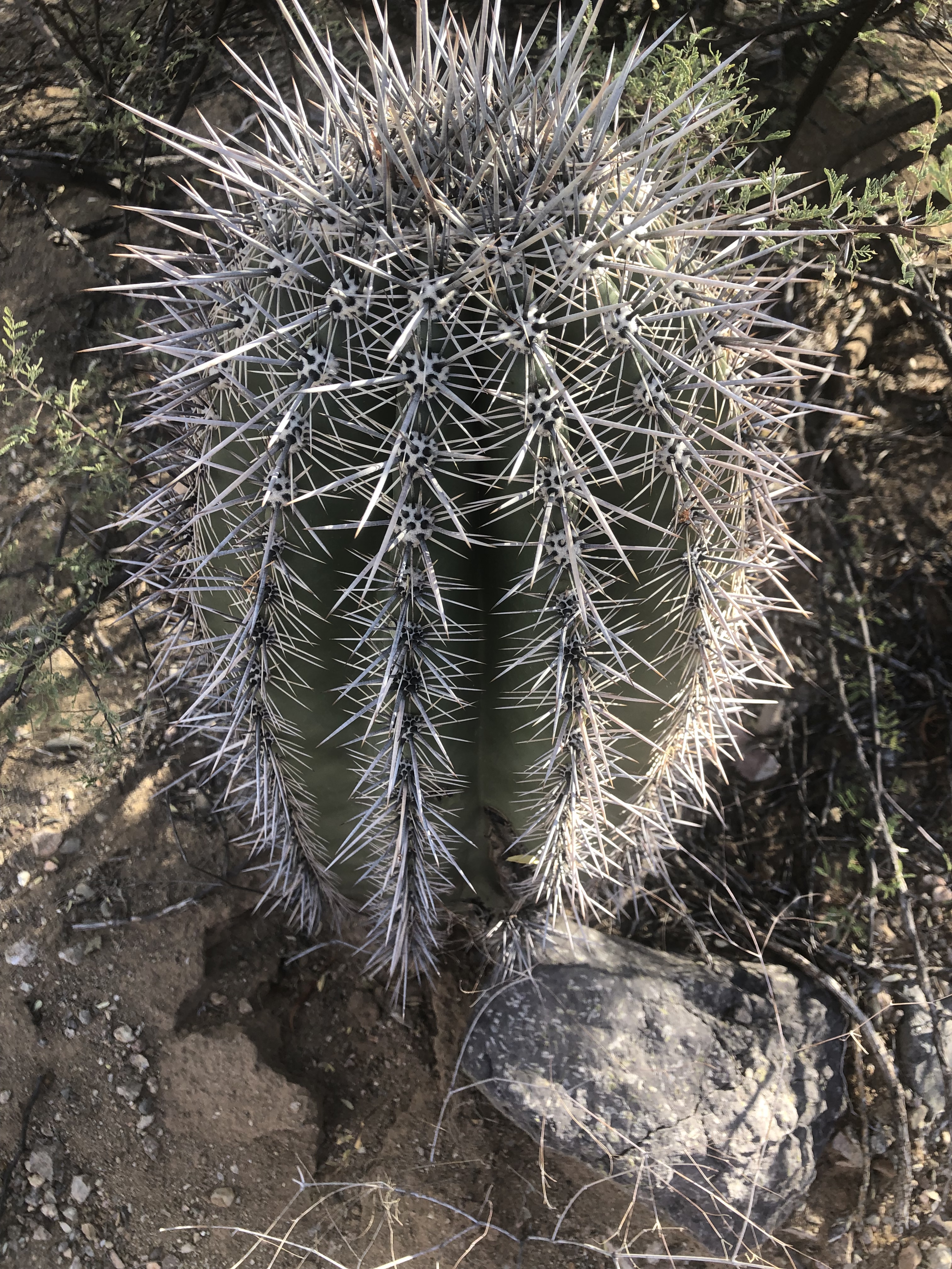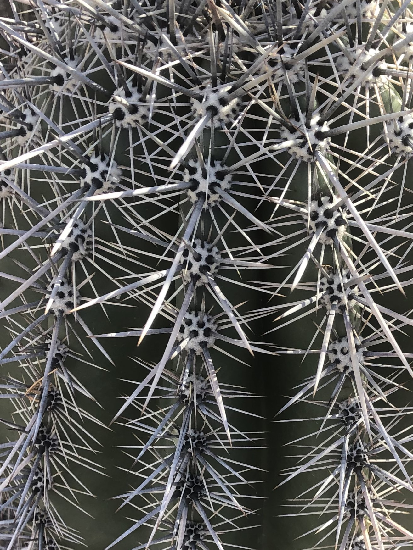 The saguaro has 12-25 ribs, and the spines line the ribs. However, the spines are not just in a row on the rib. Cacti have areas where the spines protrude called an areole. From this areole on the saguaro several central spines emerge and are surrounded by a circle of radial spines. Think of the spines like leaves and the areoles as the area on the plant where the leaves are attached. The saguaro ribs are lined with areoles. The number of central and radial spines, as well as the shape and color of the spines, are some of the ways that scientists identify different species of cacti.