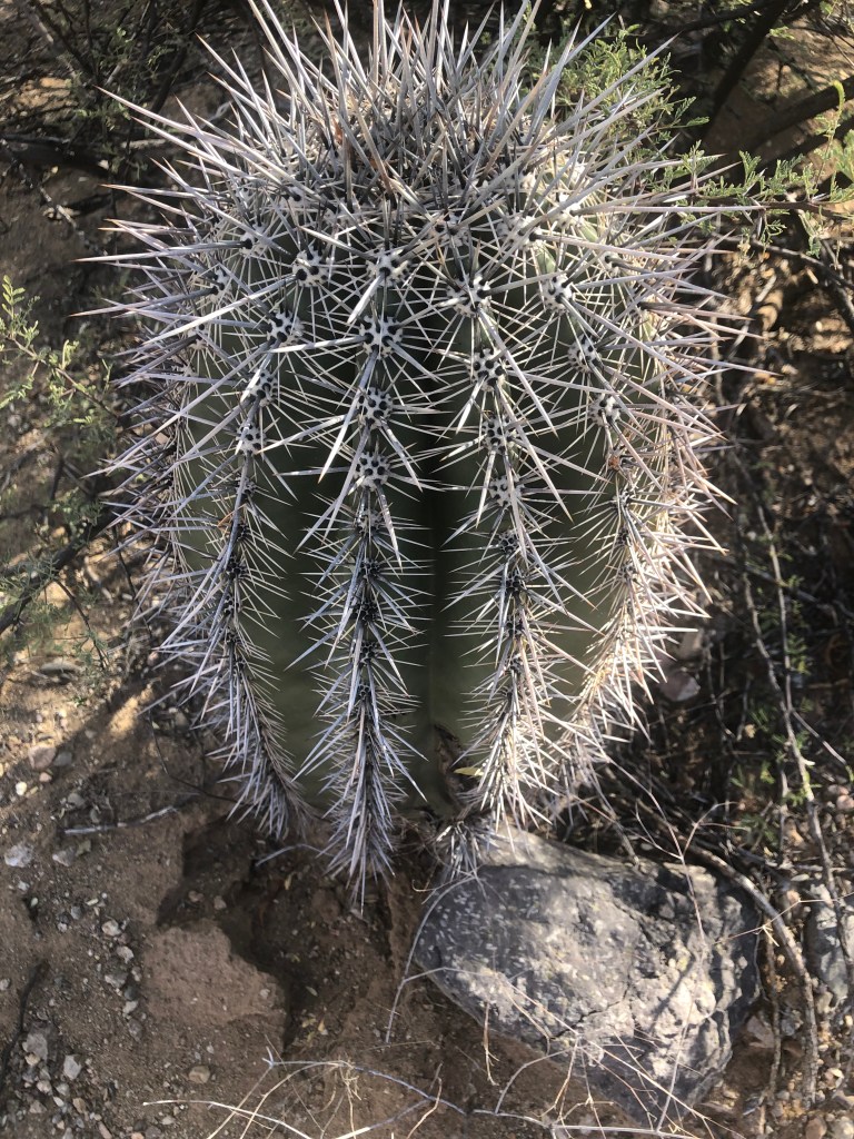 In the spring the saguaros will flower and fruit in the spring, with a ring of white flowers around the top like a crown. Each fruit contains about 3500 seeds, which are tiny and black. You might ask if there are so many seeds, why aren’t there saguaros everywhere. I have learned from trying to grow saguaros from seeds that they need a lot of water to get going, and we don’t have that in the desert very often. Mine kept dying when I left on a work trip. They cannot have too much or too little rain, and cannot stand temperatures that are too cold (they are more heat tolerant). So I think it is very special for a saguaro seed to take hold and grow in nature. The ideal conditions in nature are rare, and even then, the seedlings could be trampled or eaten by animals.