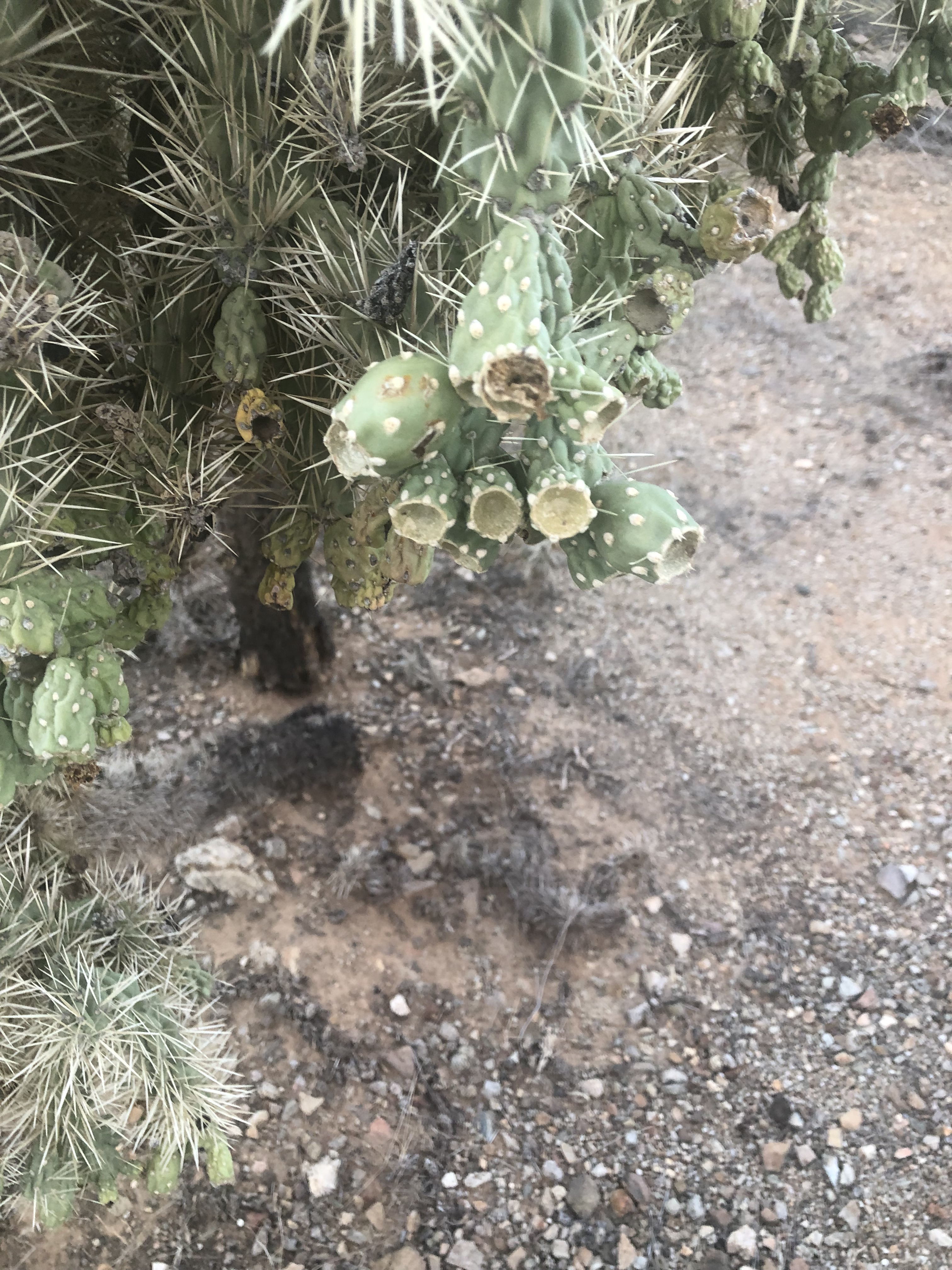 The chain-fruit cholla is Cylindropuntia fulgida. As you can see from the pictures, it is aptly nicknamed because the fruit hang in chains below the stem. This makes them very easy to identify. They look like a bush or shrub or like a small tree, with cylindrical stems that branch from one or more trunks. The stems are segmented and have prominent tubercles. In simple terms, a tubercle is a protuberance, and the areole is at the end of the tubercle (remember that the areoles are the area from which the spines emerge). Not all cacti have tubercles – last week’s prickly pear stem was a flat pad with the areoles spread around the flat part of the stem and along the edge with no tubercles present. More technically, the tubercle is the leaf base and the spines are modified leaves. Tubercles can line up to form ribs, as we saw in the saguaro, could be spiral or random. In the case of the chain-fruit cholla, they are all around the stem but do not form ribs or spirals.