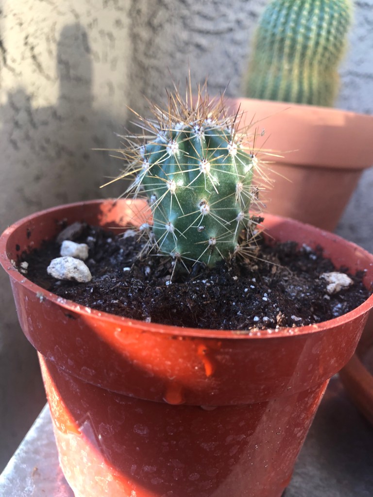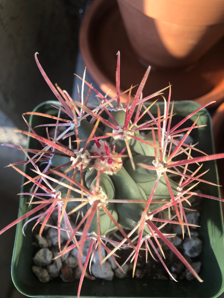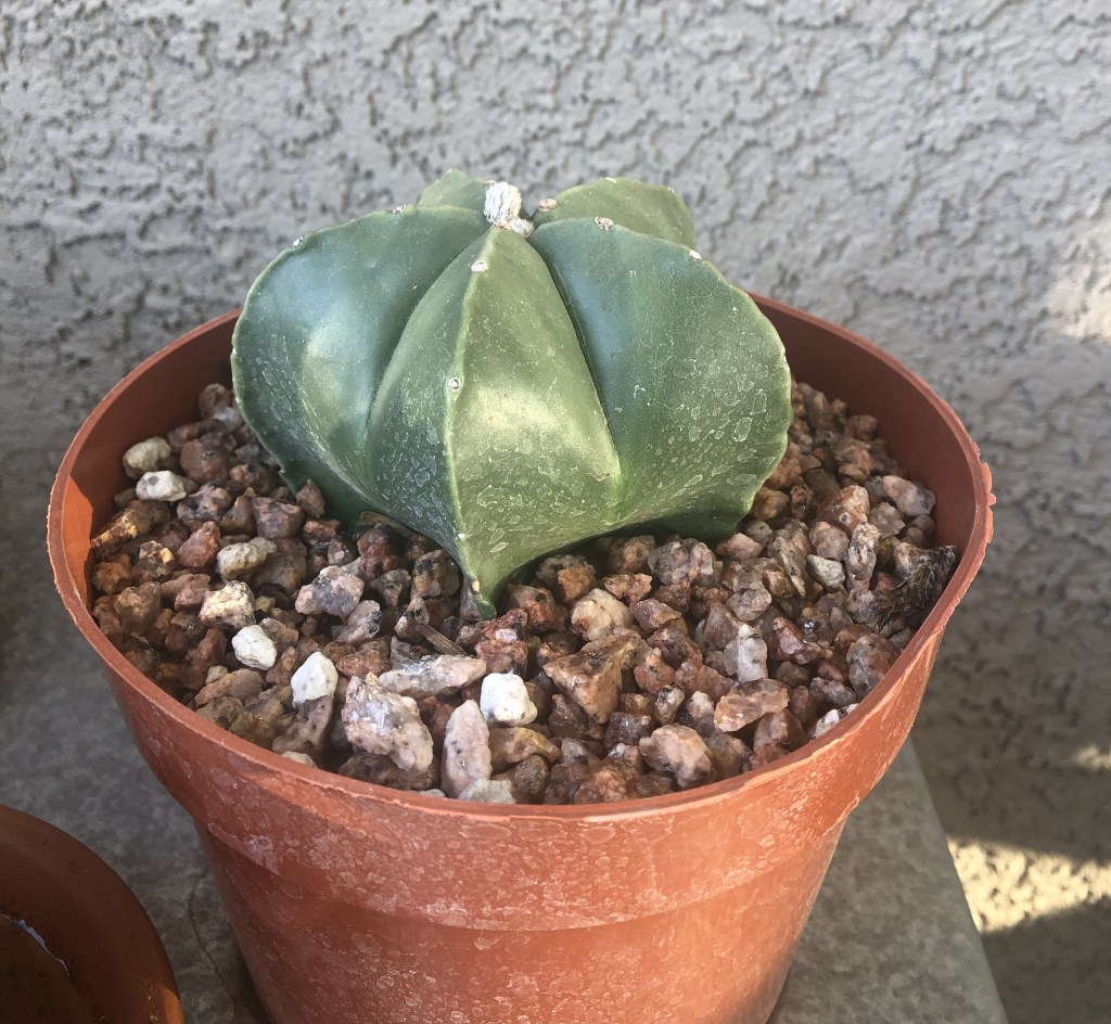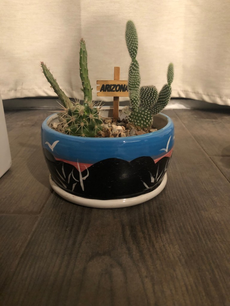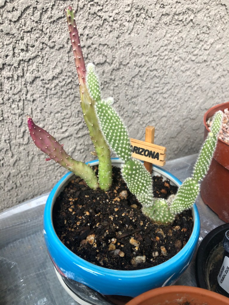 Speaking of my collection, last April was my first purchase – a traveling cactus garden. I was unfamiliar with the concept, but it is a cactus garden in a box. It has three little cacti, a planter dish, soil and rocks, and a little ‘Arizona’ sign. I bought it at a tourist shop in Jerome, Arizona. The idea is that it can be closed up in the box for several days and travel home with you from your vacation. Mine has a prickly pear, a ball cactus, and one that looks like rabbit ears. I am not sure what the rabbit ear one is, but it could be a type of prickly pear – there are a few that look like rabbit ears and badger tails rather than the better-known rounded paddles. Below are a series of pictures over the last year showing how quickly they grew. I have enjoyed watching them grow, particularly watching the prickly pear grow new stem segments. In November I bought a little saguaro at the Arizona-Sonoran Desert Museum (https://www.desertmuseum.org/ – if you are near Tucson, stop by for a visit – you can see plants, but also javalinas, big horn sheep, hummingbirds, and much more). I recently repotted it, and I am going to see if I watering it a little extra will speed up growth. At the beginning of January I bought four new cacti at the Boyce Thompson Arboretum (worth a visit if you are in the area – about an hour drive east of Phoenix – https://btarboretum.org/). I got a golden ball, Parodia leninghausii, which is not looking very round right now. It has a brown streak that I did not notice when I purchased it, giving it more of a columnar appearance. Maybe that was why it was on the sale table, or maybe I didn’t water it enough. This cactus is native to South America, will have yellow flowers, and its spines appear yellow also. I picked out a prism cactus, Leuchtenbergia principis, which is native to Mexico and also has yellow flowers in the spring. This one just looked interesting and not like most other cacti I see, even in the botanical gardens. The next one is a fire barrel, Ferocactus gracilis, which is native to Baja, and has red spines and red flowers. I love the color of this one. The last purchase is one of my favorite cacti, the bishop’s cap. Astrophytum myriostigma var. nudum is a green bishop’s cap, named because when it gets tall it looks like the hat a bishop wears. This one is a shorter version, native to Mexico, and gets yellow flowers in spring. I am excited because something is happening at the top of the plant, and I am not sure what (I am hoping for a flower) – I tried to get a close up of the top center so you can see. Finally, I got three new plants at the last Central Arizona (CACSS) meeting I attended – I have no idea what they are, and the new succulent from the TCASS. I picked this one, Echeveria lola, specifically because it had a long stem with multiple light orange flowers. I am enjoying getting free plants at the meetings, and maybe one day I will have plant babies to share. For now I am content to increase my collection with the generous extras of my fellow members. I will keep everyone updated if I get flowers on the bishop’s cap! Until next time, happy gardening!