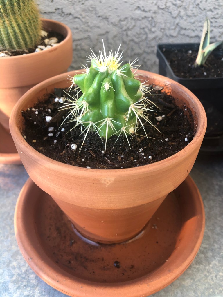 Mr. White listed a variety of components that can be included in the soil, from sand and bark to pumice and composted yard waste, and much more. He indicated that the mixture should change based on pot size. For example, seedlings would need a different mixture than larger cacti and potted trees. The sand provides space for air, while a substance like clay is very dense and does not allow much air in the soil. Larger components like bark and pumice stone are important for drainage. He also talked about fertilizer options, carbon-nitrogen ratio, and pH, but not in-depth – there is a lot of research that could be done here for the serious gardener, especially if you are planting in the ground. I am not going that far into the weeds since I am only growing small plants in pots. I still have questions about watering – I think I was not watering enough because I was afraid of over watering. I am watering more and have not seen any detrimental effects.