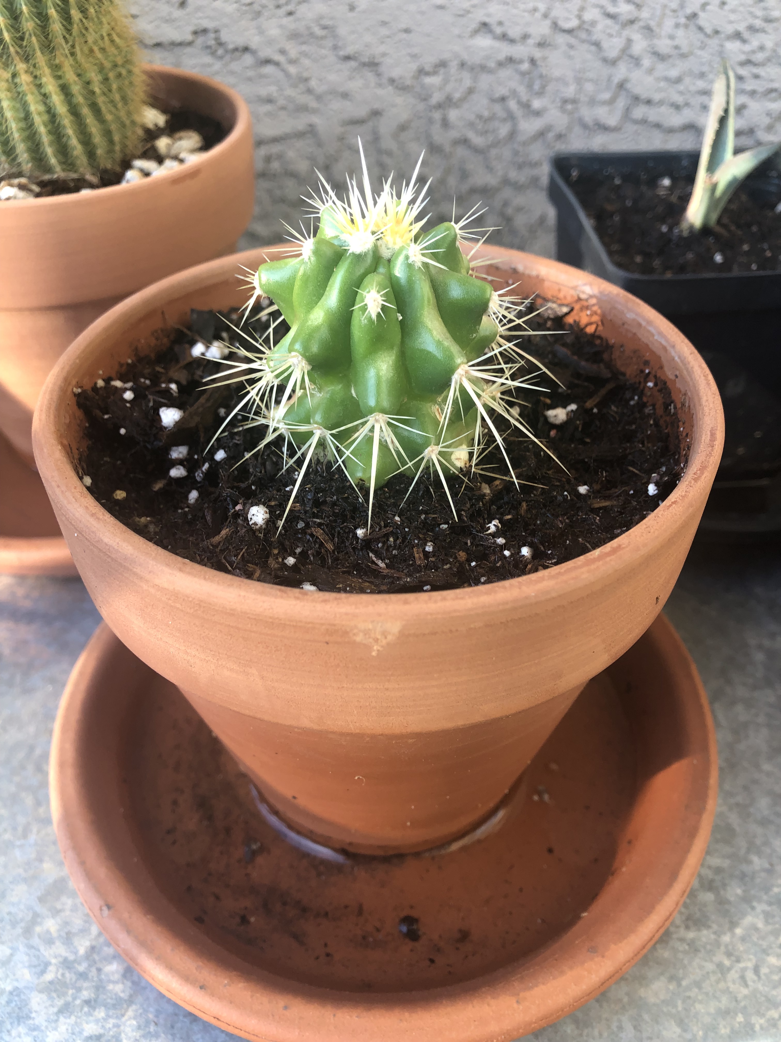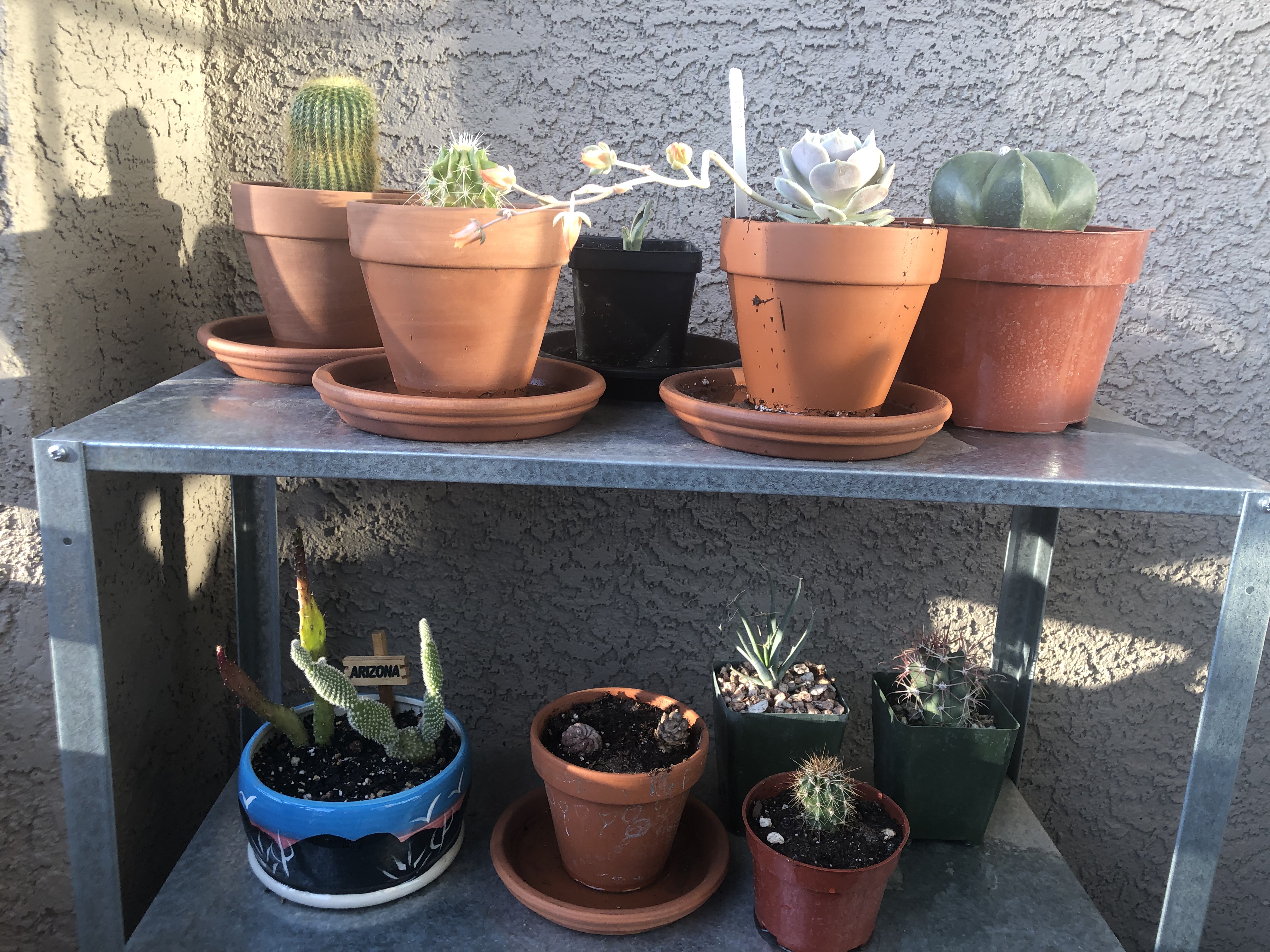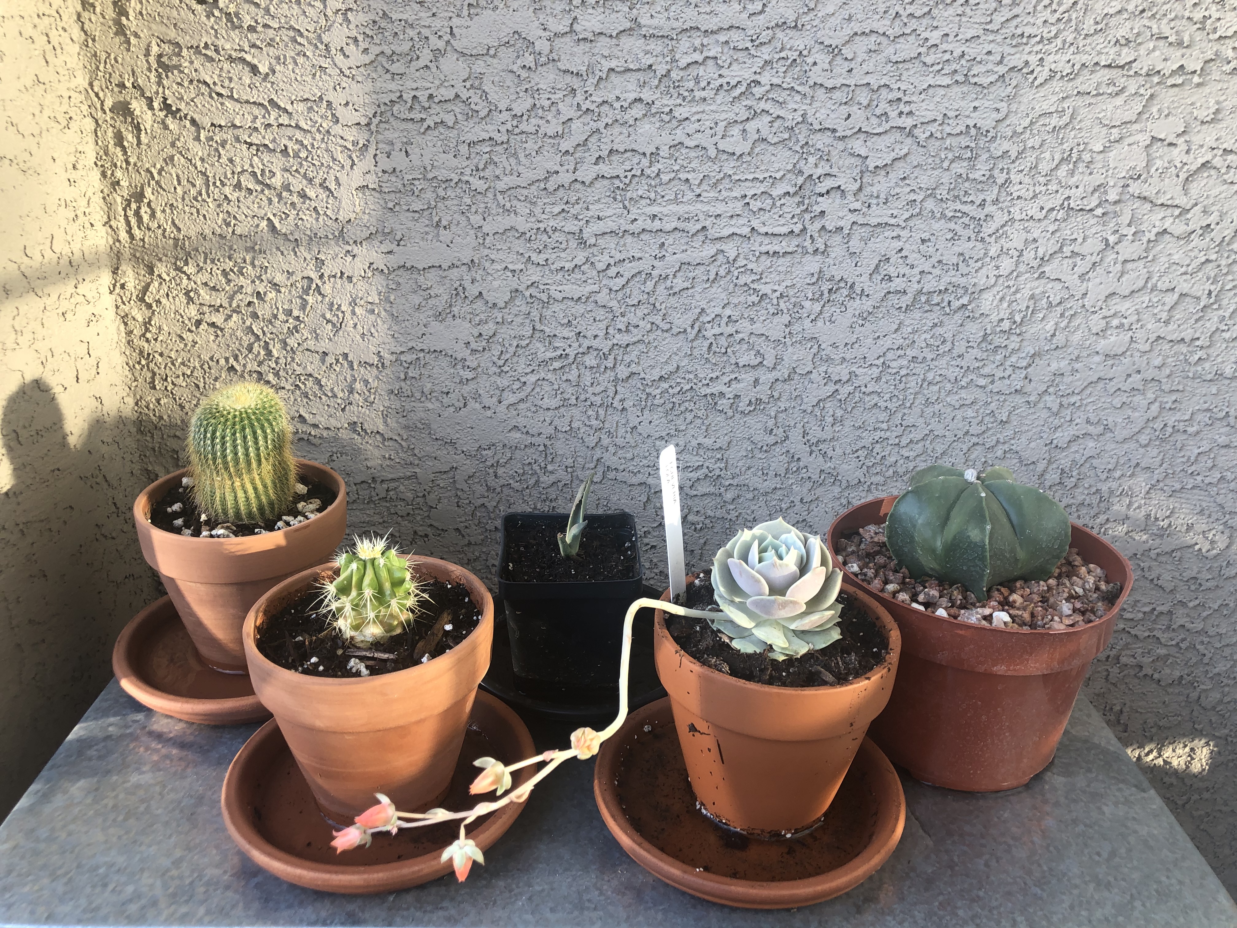 Speaking of my collection, last April was my first purchase – a traveling cactus garden. I was unfamiliar with the concept, but it is a cactus garden in a box. It has three little cacti, a planter dish, soil and rocks, and a little ‘Arizona’ sign. I bought it at a tourist shop in Jerome, Arizona. The idea is that it can be closed up in the box for several days and travel home with you from your vacation. Mine has a prickly pear, a ball cactus, and one that looks like rabbit ears. I am not sure what the rabbit ear one is, but it could be a type of prickly pear – there are a few that look like rabbit ears and badger tails rather than the better-known rounded paddles. Below are a series of pictures over the last year showing how quickly they grew. I have enjoyed watching them grow, particularly watching the prickly pear grow new stem segments. In November I bought a little saguaro at the Arizona-Sonoran Desert Museum (https://www.desertmuseum.org/ – if you are near Tucson, stop by for a visit – you can see plants, but also javalinas, big horn sheep, hummingbirds, and much more). I recently repotted it, and I am going to see if I watering it a little extra will speed up growth. At the beginning of January I bought four new cacti at the Boyce Thompson Arboretum (worth a visit if you are in the area – about an hour drive east of Phoenix – https://btarboretum.org/). I got a golden ball, Parodia leninghausii, which is not looking very round right now. It has a brown streak that I did not notice when I purchased it, giving it more of a columnar appearance. Maybe that was why it was on the sale table, or maybe I didn’t water it enough. This cactus is native to South America, will have yellow flowers, and its spines appear yellow also. I picked out a prism cactus, Leuchtenbergia principis, which is native to Mexico and also has yellow flowers in the spring. This one just looked interesting and not like most other cacti I see, even in the botanical gardens. The next one is a fire barrel, Ferocactus gracilis, which is native to Baja, and has red spines and red flowers. I love the color of this one. The last purchase is one of my favorite cacti, the bishop’s cap. Astrophytum myriostigma var. nudum is a green bishop’s cap, named because when it gets tall it looks like the hat a bishop wears. This one is a shorter version, native to Mexico, and gets yellow flowers in spring. I am excited because something is happening at the top of the plant, and I am not sure what (I am hoping for a flower) – I tried to get a close up of the top center so you can see. Finally, I got three new plants at the last Central Arizona (CACSS) meeting I attended – I have no idea what they are, and the new succulent from the TCASS. I picked this one, Echeveria lola, specifically because it had a long stem with multiple light orange flowers. I am enjoying getting free plants at the meetings, and maybe one day I will have plant babies to share. For now I am content to increase my collection with the generous extras of my fellow members. I will keep everyone updated if I get flowers on the bishop’s cap! Until next time, happy gardening!