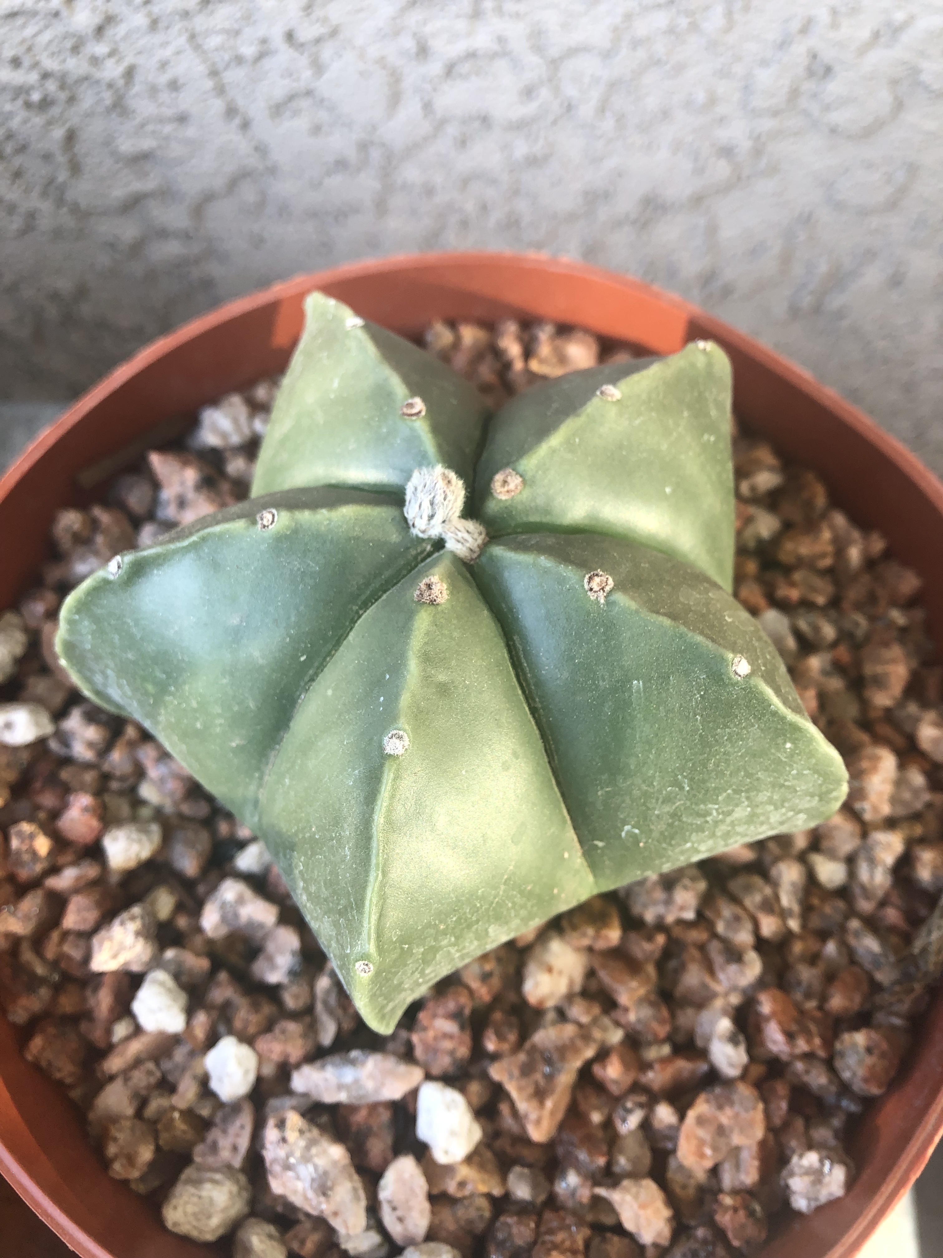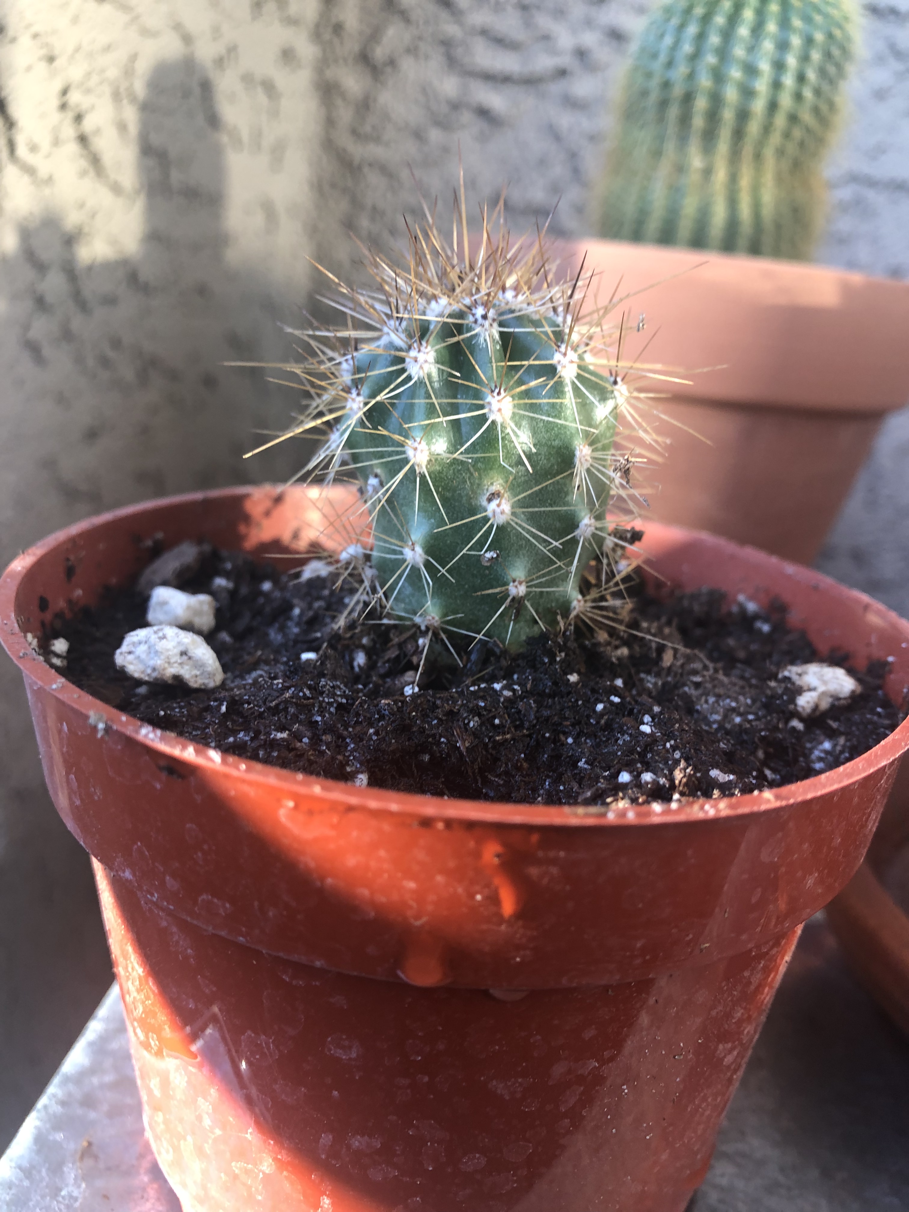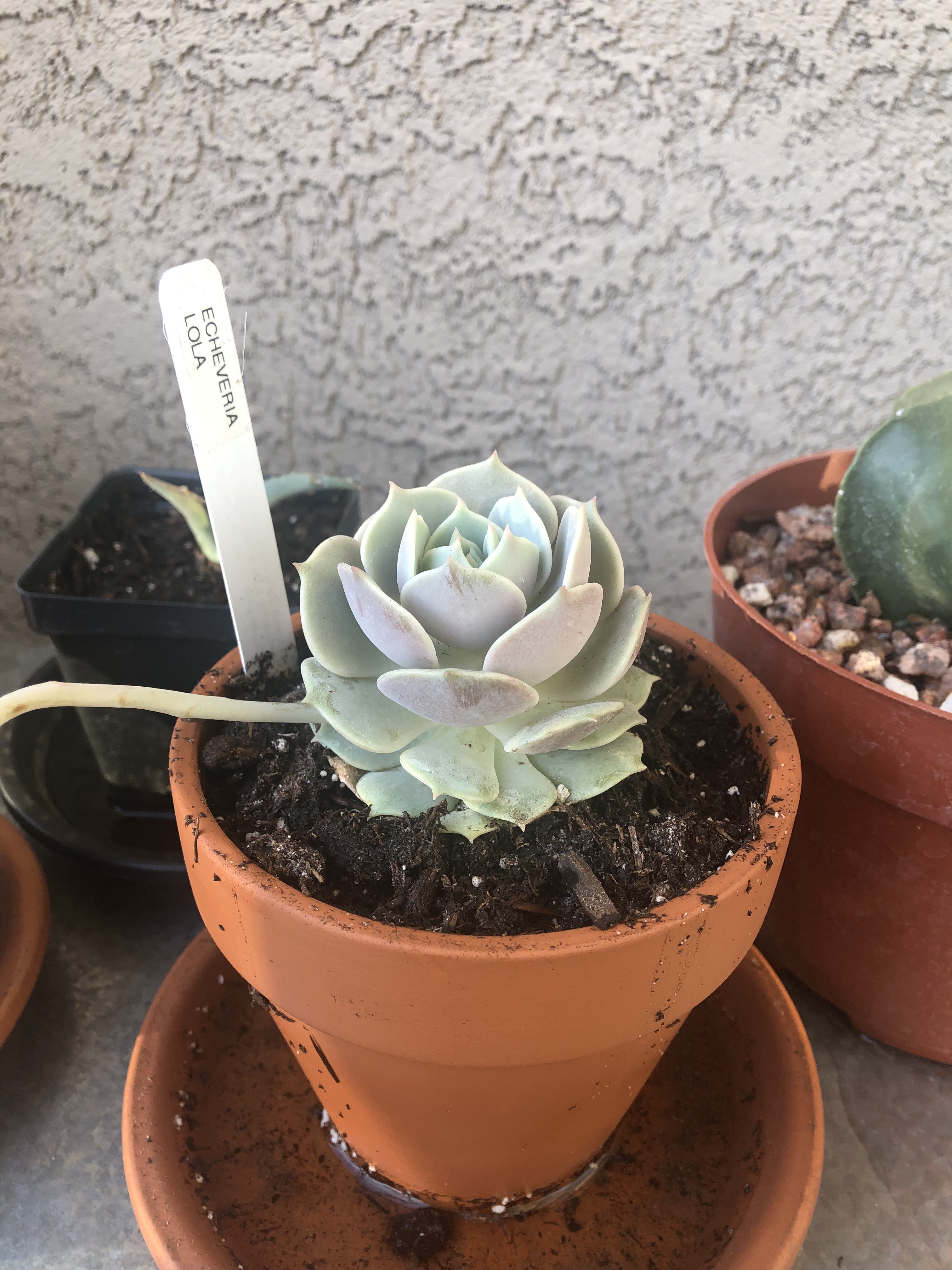Speaking of my collection, last April was my first purchase – a traveling cactus garden. I was unfamiliar with the concept, but it is a cactus garden in a box. It has three little cacti, a planter dish, soil and rocks, and a little ‘Arizona’ sign. I bought it at a tourist shop in Jerome, Arizona. The idea is that it can be closed up in the box for several days and travel home with you from your vacation. Mine has a prickly pear, a ball cactus, and one that looks like rabbit ears. I am not sure what the rabbit ear one is, but it could be a type of prickly pear – there are a few that look like rabbit ears and badger tails rather than the better-known rounded paddles. Below are a series of pictures over the last year showing how quickly they grew. I have enjoyed watching them grow, particularly watching the prickly pear grow new stem segments. In November I bought a little saguaro at the Arizona-Sonoran Desert Museum (https://www.desertmuseum.org/ – if you are near Tucson, stop by for a visit – you can see plants, but also javalinas, big horn sheep, hummingbirds, and much more). I recently repotted it, and I am going to see if I watering it a little extra will speed up growth. At the beginning of January I bought four new cacti at the Boyce Thompson Arboretum (worth a visit if you are in the area – about an hour drive east of Phoenix – https://btarboretum.org/). I got a golden ball, Parodia leninghausii, which is not looking very round right now. It has a brown streak that I did not notice when I purchased it, giving it more of a columnar appearance. Maybe that was why it was on the sale table, or maybe I didn’t water it enough. This cactus is native to South America, will have yellow flowers, and its spines appear yellow also. I picked out a prism cactus, Leuchtenbergia principis, which is native to Mexico and also has yellow flowers in the spring. This one just looked interesting and not like most other cacti I see, even in the botanical gardens. The next one is a fire barrel, Ferocactus gracilis, which is native to Baja, and has red spines and red flowers. I love the color of this one. The last purchase is one of my favorite cacti, the bishop’s cap. Astrophytum myriostigma var. nudum is a green bishop’s cap, named because when it gets tall it looks like the hat a bishop wears. This one is a shorter version, native to Mexico, and gets yellow flowers in spring. I am excited because something is happening at the top of the plant, and I am not sure what (I am hoping for a flower) – I tried to get a close up of the top center so you can see. Finally, I got three new plants at the last Central Arizona (CACSS) meeting I attended – I have no idea what they are, and the new succulent from the TCASS. I picked this one, Echeveria lola, specifically because it had a long stem with multiple light orange flowers. I am enjoying getting free plants at the meetings, and maybe one day I will have plant babies to share. For now I am content to increase my collection with the generous extras of my fellow members. I will keep everyone updated if I get flowers on the bishop’s cap! Until next time, happy gardening!